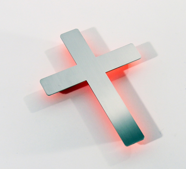 Sehr edel aussehendes Kreuz für die Wand. Dieses Kreuz ist aus Edelstahl und hochglänzend poliert. Es sollte an einer weißen Wand hängen.